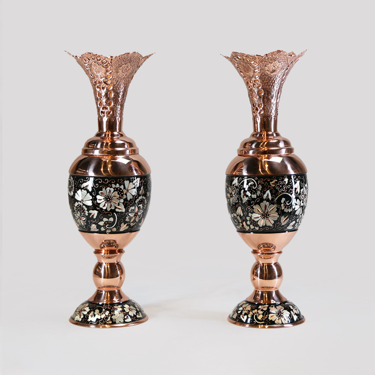 این جفت سنبلدان، نمادی از تلاقی هنر فلزکاری و ظرافت نقرهکوبی است. بدنه این محصول از مس مرغوب ساخته شده که با هنر دست هنرمندان ماهر، مفتولهای نقره با عیار بالا بر روی آن نشانده شدهاند تا طرحهای اسلیمی و گلومرغ را به زیبایی هرچه تمامتر به نمایش بگذارند.