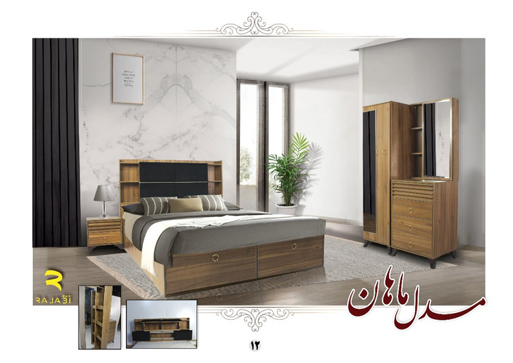 سرویس خواب ماهان با طراحی ساده و عملکرد چندمنظوره، مناسب کسانیه که به دنبال ترکیب زیبایی، نظم و فضای ذخیرهسازی بیشتر هستن. این سرویس شامل تخت دو نفره با کفی جکدار، تاج تخت با طبقه و نور مخفی، دو پاتختی، کمد لباس آینهدار و فایل کشوییه.
